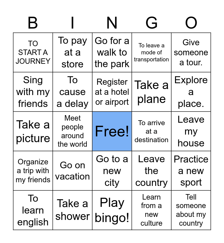 This bingo card has a free space and 24 words: Go on vacation, Take a shower, Register at a hotel or airport, To learn english, Give someone a tour., TO START A JOURNEY, Sing with my friends, To pay at a store, To arrive at a destination, Go to a new city, Take a plane, Take a picture, Leave the country, Practice a new sport, To cause a delay, Learn from a new culture, Leave my house, Go for a walk to the park, Explore a place., Meet people around the world, Tell someone about my country, Organize a trip with my friends, To leave a mode of transportation and Play bingo!.