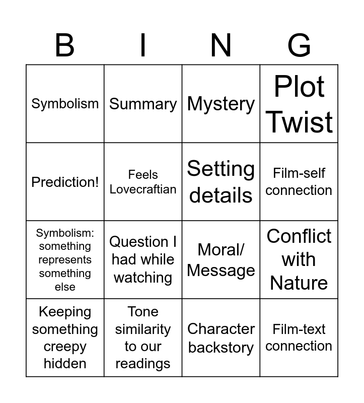 This bingo card has 23 words: Film-text connection, Film-world connection, Film-self connection, Foreshadowing moment, Prediction!, Symbolism, Feels Lovecraftian, Summary, Keeping something creepy hidden, Character has bad memory, Question I had while watching, Symbolism: something represents something else, Happiness = dangerous, Unreliable character, Tone similarity to our readings, Character development moment, Mystery, Moral/ Message, Setting details, Conflict with Nature, Plot Twist, Character backstory and Pointless feud.
