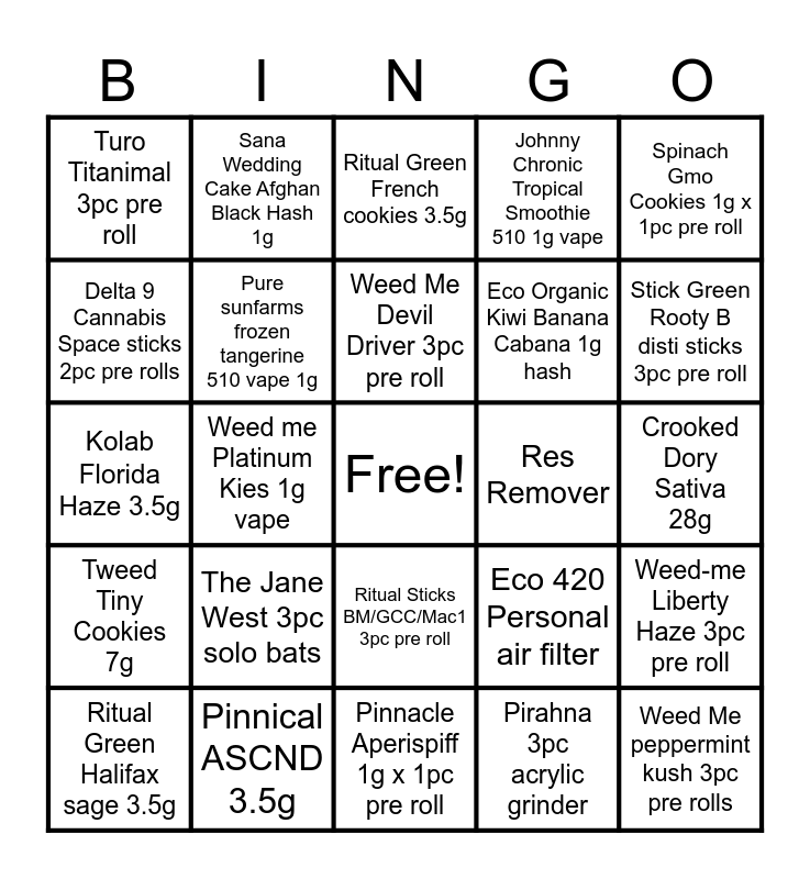 This bingo card has a free space and 24 words: The Jane West 3pc solo bats, Pinnical ASCND 3.5g, Weed Me Devil Driver 3pc pre roll, Ritual Green Halifax sage 3.5g, Spinach Gmo Cookies 1g x 1pc pre roll, Turo Titanimal 3pc pre roll, Delta 9 Cannabis Space sticks 2pc pre rolls, Sana Wedding Cake Afghan Black Hash 1g, Res Remover, Ritual Sticks BM/GCC/Mac1 3pc pre roll, Eco Organic Kiwi Banana Cabana 1g hash, Kolab Florida Haze 3.5g, Eco 420 Personal air filter, Weed-me Liberty Haze 3pc pre roll, Pure sunfarms frozen tangerine 510 vape 1g, Pirahna 3pc acrylic grinder, Crooked Dory Sativa 28g, Ritual Green French cookies 3.5g, Stick Green Rooty B disti sticks 3pc pre roll, Weed me Platinum Kies 1g vape, Weed Me peppermint kush 3pc pre rolls, Tweed Tiny Cookies 7g, Johnny Chronic Tropical Smoothie 510 1g vape and Pinnacle Aperispiff 1g x 1pc pre roll.