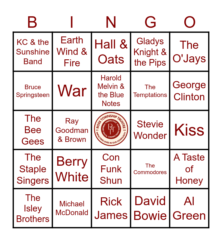 This bingo card has a free space and 29 words: The Isley Brothers, Elvis Presley, Ray Goodman & Brown, Led Zeppelin, KC & the Sunshine Band, Hall & Oats, War, Berry White, Stevie Wonder, Michael McDonald, Kiss, Al Green, Rick James, David Bowie, George Clinton, The Four Tops, Con Funk Shun, The Staple Singers, The O'Jays, The Bee Gees, The Commodores, James Brown, The Temptations, Bruce Springsteen, Gladys Knight & the Pips, Earth Wind & Fire, A Taste of Honey, Harold Melvin & the Blue Notes and Ohio Players.