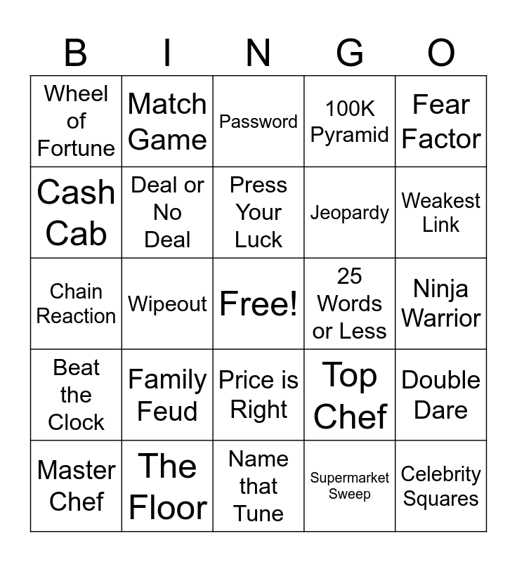 This bingo card has a free space and 24 words: Family Feud, The Floor, Press Your Luck, Master Chef, Fear Factor, Wheel of Fortune, Cash Cab, Match Game, 25 Words or Less, Price is Right, Jeopardy, Chain Reaction, Top Chef, Double Dare, Deal or No Deal, Supermarket Sweep, Ninja Warrior, Password, Weakest Link, Wipeout, Celebrity Squares, Beat the Clock, 100K Pyramid and Name that Tune.