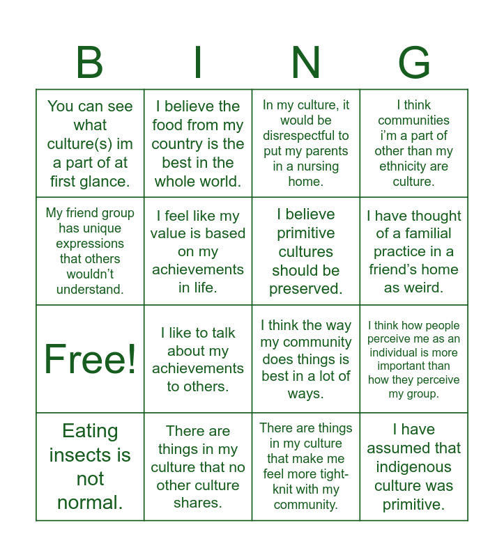 This bingo card has 20 words: I think how people perceive me as an individual is more important than how they perceive my group., I have sacrificed something for the well-being of my friend group., In my culture, it would be disrespectful to put my parents in a nursing home., I have already thought something about a passerby that another person shared outloud at the same time., Eating insects is not normal., My friend group has unique expressions that others wouldn’t understand., There are things in my culture that no other culture shares., You can see what culture(s) im a part of at first glance., Free!, I believe the food from my country is the best in the whole world., I like to talk about my achievements to others., I think the way my community does things is best in a lot of ways., I feel like my value is based on my achievements in life., I have assumed that indigenous culture was primitive., I believe primitive cultures should be preserved., I believe people in my country are friendlier., I have thought of a familial practice in a friend’s home as weird., I think communities i’m a part of other than my ethnicity are culture., There are things in my culture that make me feel more tight-knit with my community. and I have eaten the last cookie of the packet without asking my peers..