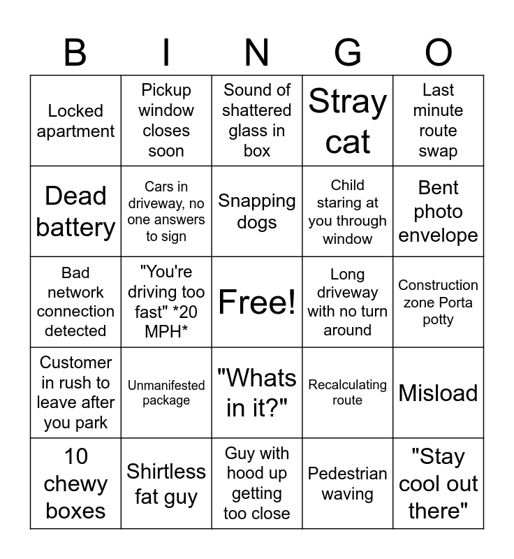 This bingo card has a free space and 24 words: Unmanifested package, Shirtless fat guy, Snapping dogs, 10 chewy boxes, Last minute route swap, Locked apartment, Dead battery, Pickup window closes soon, Long driveway with no turn around, "Whats in it?", Child staring at you through window, Bad network connection detected, Recalculating route, Misload, Cars in driveway, no one answers to sign, Pedestrian waving, Construction zone Porta potty, Sound of shattered glass in box, Bent photo envelope, "You're driving too fast" *20 MPH*, "Stay cool out there", Customer in rush to leave after you park, Stray cat and Guy with hood up getting too close.