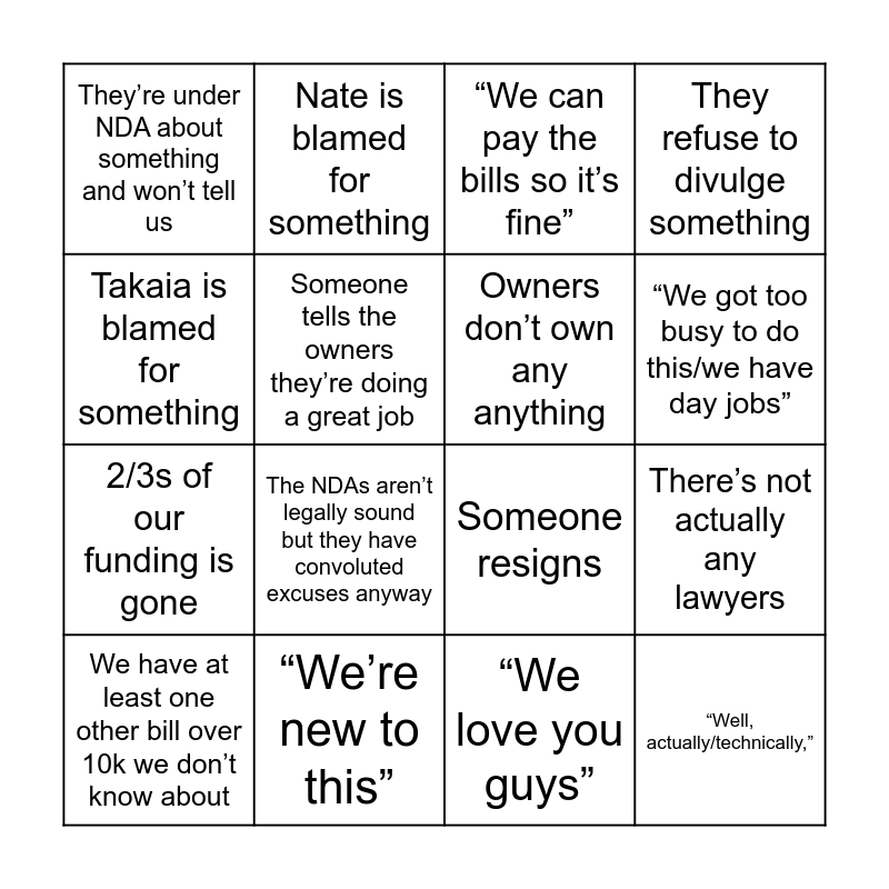 This bingo card has 16 words: “We’re new to this”, There’s not actually any lawyers, “We can pay the bills so it’s fine”, They’re under NDA about something and won’t tell us, 2/3s of our funding is gone, Nate is blamed for something, Someone resigns, “We love you guys”, Takaia is blamed for something, Someone tells the owners they’re doing a great job, We have at least one other bill over 10k we don’t know about, They refuse to divulge something, The NDAs aren’t legally sound but they have convoluted excuses anyway, “We got too busy to do this/we have day jobs”, Owners don’t own any anything and “Well, actually/technically,”.