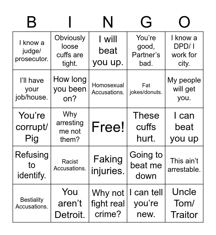 This bingo card has a free space and 24 words: Racist Accusations., You aren’t Detroit., Homosexual Accusations., Bestiality Accusations., I know a DPD/ I work for city., I know a judge/ prosecutor., I’ll have your job/house., Obviously loose cuffs are tight., These cuffs hurt., Faking injuries., Fat jokes/donuts., You’re corrupt/ Pig, Going to beat me down, This ain’t arrestable., How long you been on?, I can tell you’re new., I can beat you up, I will beat you up., My people will get you., Why arresting me not them?, Uncle Tom/ Traitor, Refusing to identify., You’re good, Partner’s bad. and Why not fight real crime?.