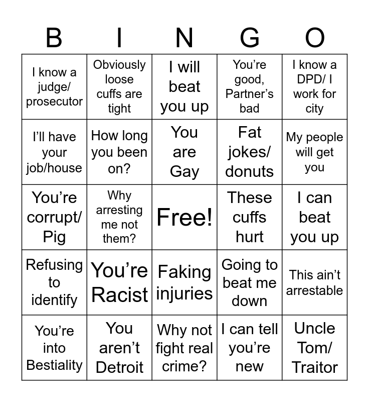 This bingo card has a free space and 24 words: You’re Racist, You aren’t Detroit, You are Gay, You’re into Bestiality, I know a DPD/ I work for city, I know a judge/ prosecutor, I’ll have your job/house, Obviously loose cuffs are tight, These cuffs hurt, Faking injuries, Fat jokes/ donuts, You’re corrupt/ Pig, Going to beat me down, This ain’t arrestable, How long you been on?, I can tell you’re new, I can beat you up, I will beat you up, My people will get you, Why arresting me not them?, Uncle Tom/ Traitor, Refusing to identify, You’re good, Partner’s bad and Why not fight real crime?.