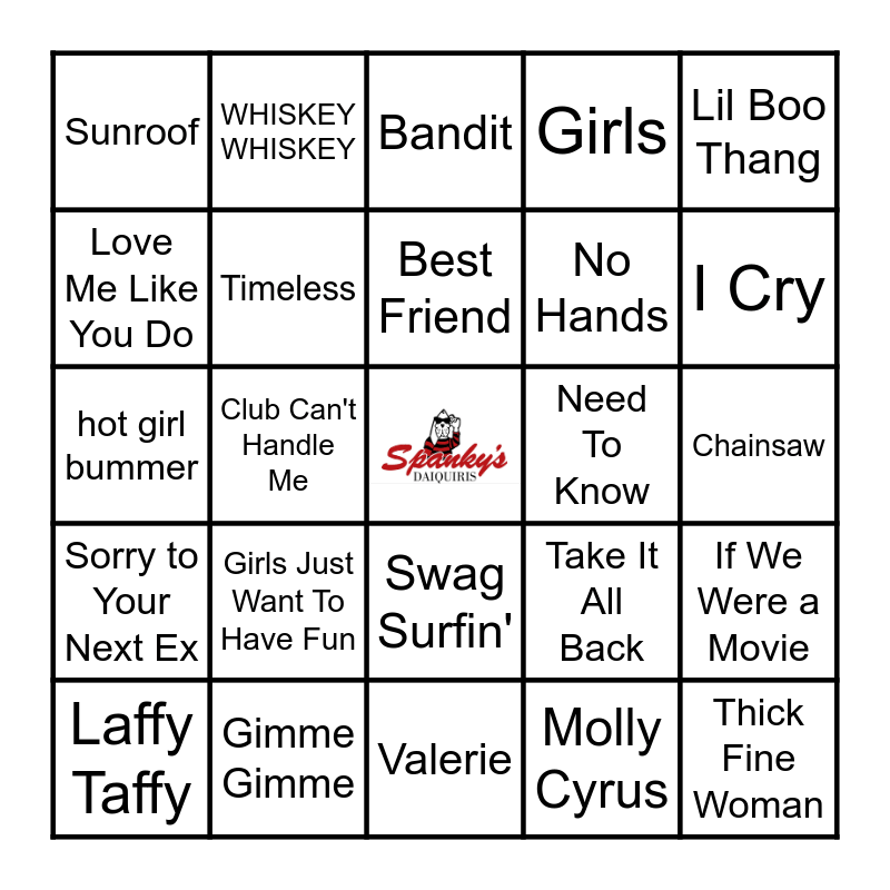 This bingo card has a free space and 92 words: Callin' Baton Rouge, Pour Some Sugar On Me, Valerie, Stanky Legg, Sweet Caroline, Sugar, We're Goin' Down, Explode, Laffy Taffy, Rich Baby Daddy, Savage, Pump the Party, Walk Around the Club, Grove St. Party, No Hands, Tear It Down, Lil Boo Thang, Bandit, Casanova, I've Been Waiting, Forever Young, Simple Song, Or What, Maps, Just a Girl, Girls Just Want To Have Fun, Timeless, The Door, Get Low, I Never Lie, Heat Waves, Gimme Gimme, Swag Surfin', Halle Berry, Get Down Tonight, WHISKEY WHISKEY, Hotel Room Service, TRUCK BED, Your Love Is My Drug, Best Friend, Take It All Back, hot girl bummer, Sorry to Your Next Ex, Chainsaw, Really Really, Thick Fine Woman, Homegurl, Pass the Dutch, Steady Mobbin, Here's To Never Growing Up, Beez In the Trap, Pop That, Baby, Beast of Burden, Stand By Me, Habits (Stay High), Throat Goat, 24K Magic, Love Me Like You Do, Drive By, Club Can't Handle Me, Jordan Belfort, Best Love Song, I Bet U Won't, La Vaca, Wake Up, Molly Cyrus, The Great Escape, Purple Rain, Sweater Weather, Boom Clap, Umbrella, Trap Queen, Girls, Rooster, Laid, More Than a Woman, If We Were a Movie, Picture To Burn, Don’t Blame Me, Easy On Me, First Class, Need To Know, Sunroof, Primadonna, Bad At Love, Caroline, Talk Too Much, Feel So Close, Super Bass, Barbie Girl, I Cry and Roses.