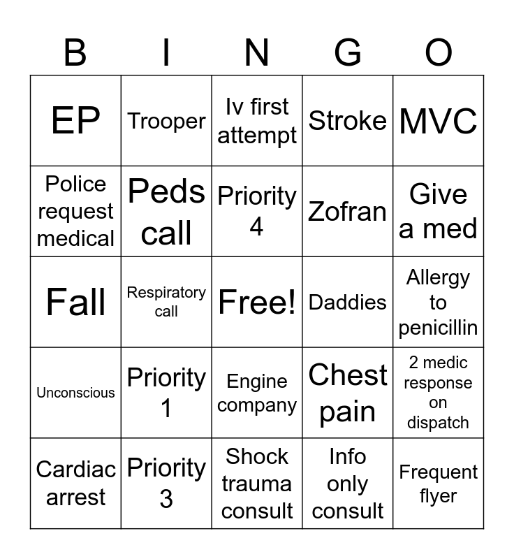 This bingo card has a free space and 24 words: Priority 1, Priority 3, Priority 4, Cardiac arrest, MVC, EP, Police request medical, Trooper, Daddies, Engine company, Zofran, Fall, Chest pain, 2 medic response on dispatch, Peds call, Info only consult, Allergy to penicillin, Iv first attempt, Give a med, Respiratory call, Frequent flyer, Unconscious, Stroke and Shock trauma consult.