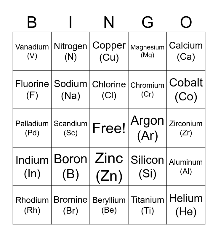 This bingo card has a free space and 50 words: Hydrogen (H), Helium (He), Lithium (Li), Beryllium (Be), Boron (B), Carbon (C), Nitrogen (N), Oxygen (O), Fluorine (F), Neon (Ne), Sodium (Na), Magnesium (Mg), Aluminum (Al), Silicon (Si), Phosphorus (P), Sulfur (S), Chlorine (Cl), Argon (Ar), Potassium (K), Calcium (Ca), Scandium (Sc), Titanium (Ti), Vanadium (V), Chromium (Cr), Manganese (Mn), Iron (Fe), Cobalt (Co), Nickel (Ni), Copper (Cu), Zinc (Zn), Gallium (Ga), Germanium (Ge), Arsenic (As), Selenium (Se), Bromine (Br), Krypton (Kr), Rubidium (Rb), Strontium (Sr), Yttrium (Y), Zirconium (Zr), Niobium (Nb), Molybdenum (Mo), Technetium (Tc), Ruthenium (Ru), Rhodium (Rh), Palladium (Pd), Silver (Ag), Cadmium (Cd), Indium (In) and Tin (Sn).