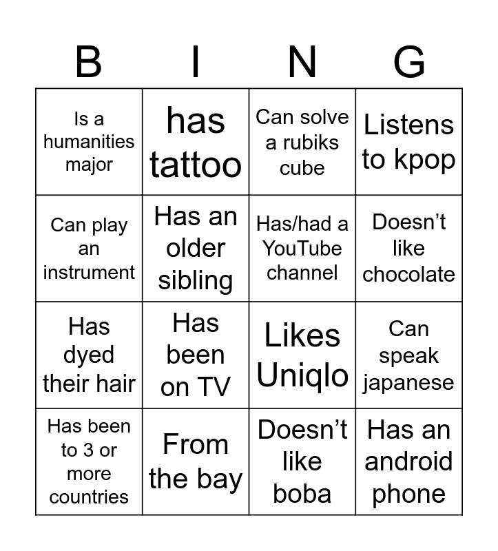 This bingo card has 16 words: From the bay, Can speak japanese, Can solve a rubiks cube, Is a humanities major, Has dyed their hair, has tattoo, Likes Uniqlo, Doesn’t like boba, Can play an instrument, Has an older sibling, Has been to 3 or more countries, Listens to kpop, Has been on TV, Doesn’t like chocolate, Has/had a YouTube channel and Has an android phone.