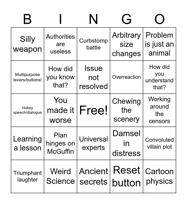 This bingo card has a free space and 38 words: Colour bleed, Misogyny, Racism, How did you know that?, Convoluted villain plot, Plan hinges on McGuffin, Issue not resolved, Problem is hero/bystander fault, Problem is just an animal, Overreaction, You made it worse, Arbitrary size changes, Cartoon physics, Working around the censors, Multipurpose levers/buttons!, Learning a lesson, Hero sadism, Curbstomp battle, Arbitrary stupidity, Chewing the scenery, Silly weapon, Weird Science, How did you understand that?, Triumphant laughter, Obvious political commentary, Ancient secrets, Animal mascot hijinks, Animal as a weapon, Hidden villain/sudden betrayal, Evil face, Explains the plan, Universal experts, Reset button, Authorities are useless, Meaningless destruction, Damsel in distress, Hokey speech/dialogue and All your eggs in one McGuffin.