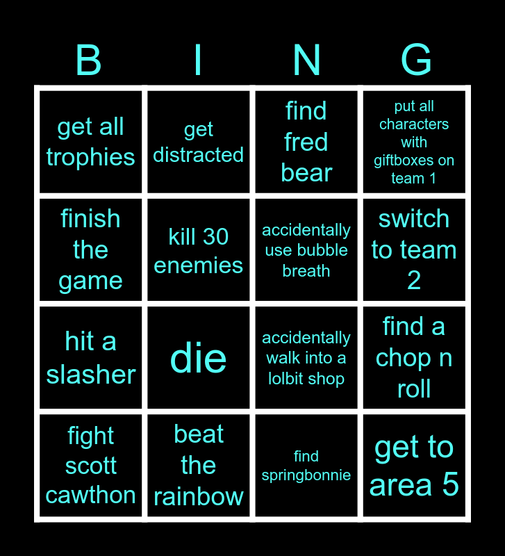 This bingo card has 20 words: find a chop n roll, kill the rainbow, find fred bear, run into a golden endo, fight scott cawthon, finish the game, beat the rainbow, get all trophies, hit a slasher, get distracted, die, accidentally walk into a lolbit shop, kill 30 enemies, get to area 5, accidentally use bubble breath, use prize ball 2, switch to team 2, put all characters with giftboxes on team 1, find springbonnie and go to the update 2 area.