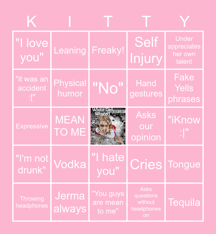 This bingo card has a free space and 28 words: Tongue, Very frequent close ups, Hand gestures, Asks questions without headphones on, "it was an accident :[", Freaky!, Leaning, "I'm not drunk", Asks our opinion, Throwing headphones, Expressive, Self Injury, Jerma always, "You guys are mean to me", Fake Yells phrases, Floor Time, Vodka, Physical humor, "No", "I hate you", "I love you", Margarita, Tequila, MEAN TO ME, "iKnow :|", Cries, Under appreciates her own talent and Overly apologetic.