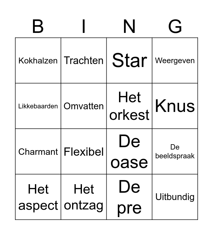 This bingo card has 24 words: Relaxed, De sfeef, Knus, Het succes, Likkebaarden, Kokhalzen, Omvatten, Trachten, Het ontzag, Dubieus, Charmant, De oase, Zwijmelen, Het concert, Het orkest, De kick, De pre, Star, Flexibel, De beeldspraak, Het aspect, Uitbundig, Weergeven and Centraal.