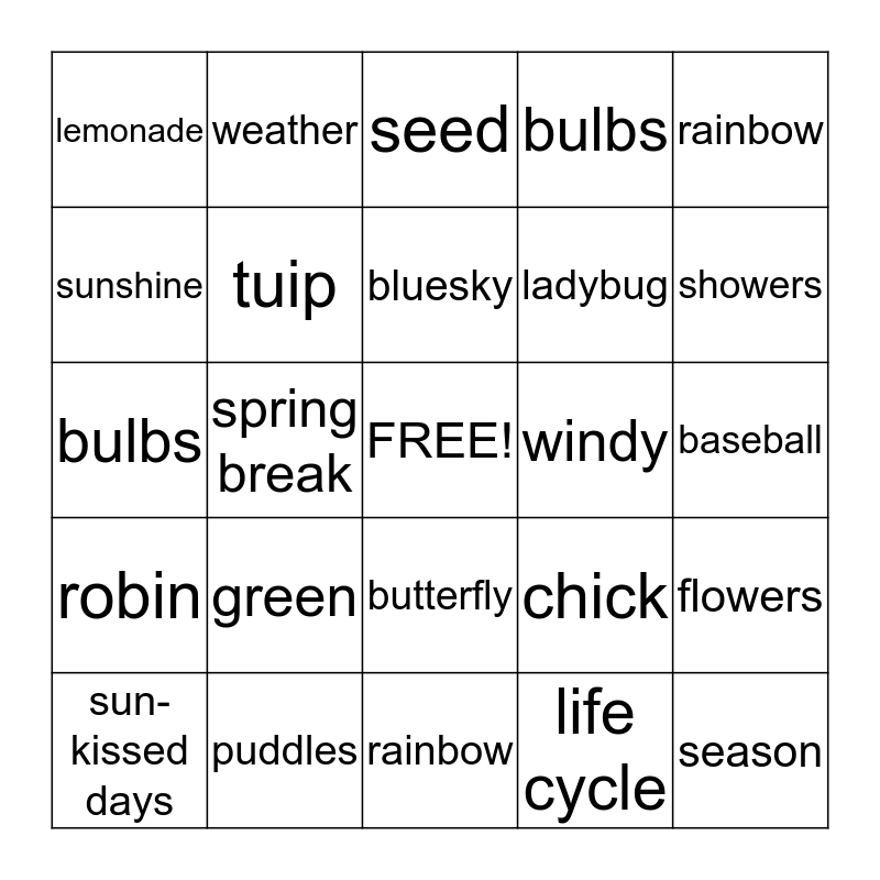 This bingo card has a free space and 25 words: green, rainbow, bluesky, sun-kissed days, rainbow, lemonade, sunshine, weather, windy, butterfly, ladybug, bulbs, chick, flowers, tuip, grass, baseball, seed, showers, spring break, season, puddles, robin, bulbs and life cycle.