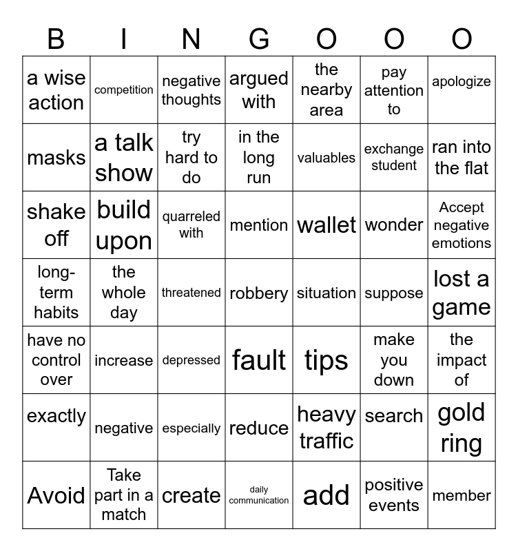 This bingo card has a free space and 48 words: heavy traffic, exchange student, daily communication, the whole day, quarreled with, lost a game, competition, Take part in a match, pay attention to, fault, apologize, argued with, wonder, wallet, exactly, suppose, masks, ran into the flat, search, the nearby area, valuables, threatened, a wise action, a talk show, gold ring, try hard to do, Accept negative emotions, Avoid, mention, build upon, positive events, situation, the impact of, negative, long-term habits, tips, make you down, shake off, depressed, especially, have no control over, member, negative thoughts, create, in the long run, reduce, increase and add.