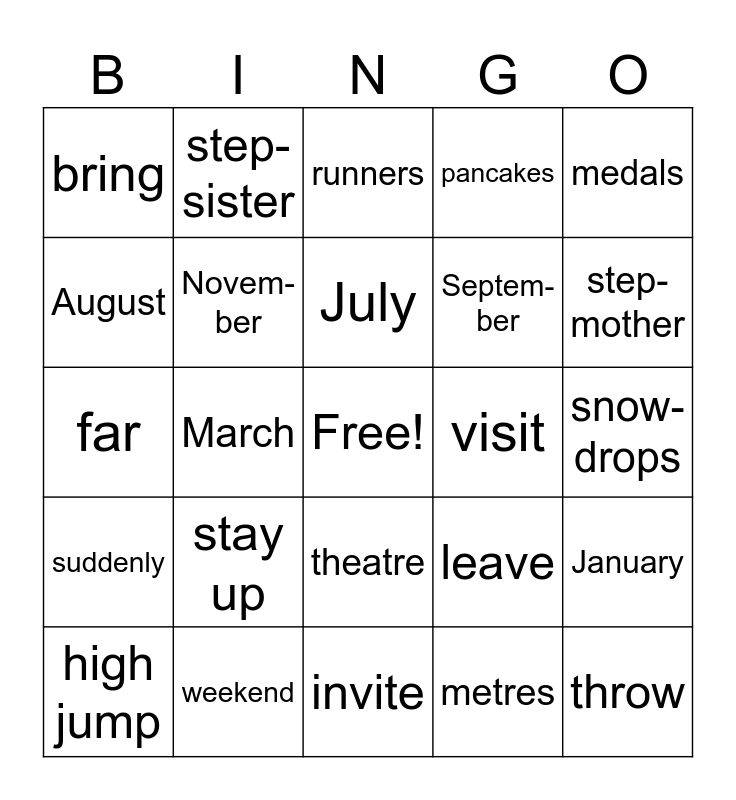 This bingo card has a free space and 43 words: excited, throw, long jump, high jump, winner, metres, runners, better than, medals, weekend, pancakes, visit, theatre, stay up, meal, invite, food, far, away, step-mother, step-sister, unhappy, hate, bring, forest, snow-drops, cry, without, leave, suddenly, bonfire, January, February, March, April, May, June, July, August, Septem-ber, October, Novem-ber and Decem-ber.