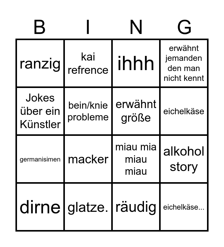 This bingo card has 17 words: räudig, dirne, ihhh, ranzig, macker, erwähnt jemanden den man nicht kennt, alkohol story, erwähnt größe, eichelkäse, bein/knie probleme, glatze., miau mia miau miau, Jokes über ein Künstler, kai refrence, germanisimen, knecht and eichelkäse....
