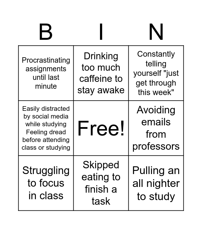 This bingo card has a free space and 8 words: Avoiding emails from professors, Constantly telling yourself "just get through this week", Drinking too much caffeine to stay awake, Struggling to focus in class, Procrastinating assignments until last minute, Pulling an all nighter to study, Easily distracted by social media while studying Feeling dread before attending class or studying and Skipped eating to finish a task.
