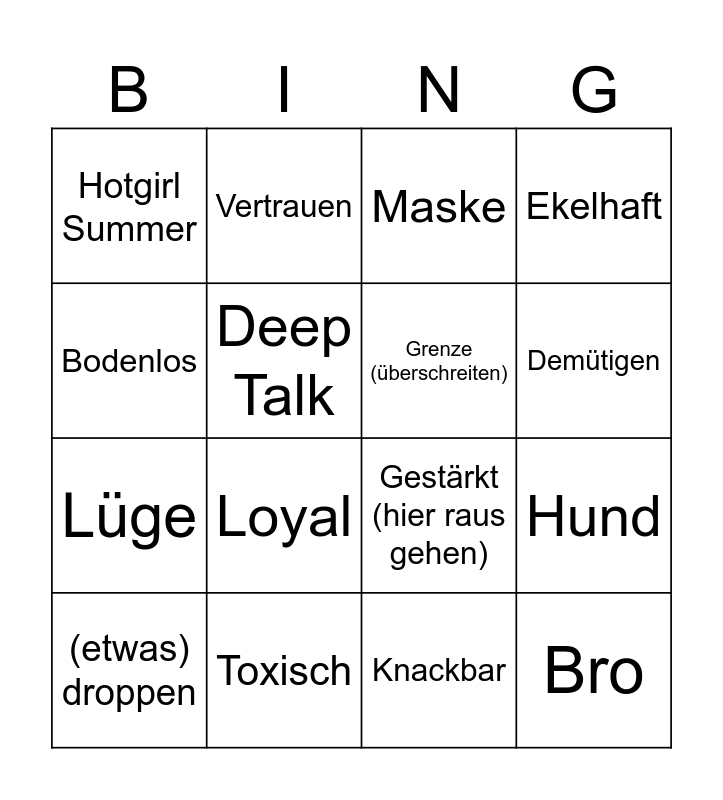 This bingo card has 16 words: Toxisch, Hund, Maske, Hotgirl Summer, Lüge, Vertrauen, Gestärkt (hier raus gehen), Knackbar, Bodenlos, Deep Talk, (etwas) droppen, Ekelhaft, Loyal, Demütigen, Grenze (überschreiten) and Bro.