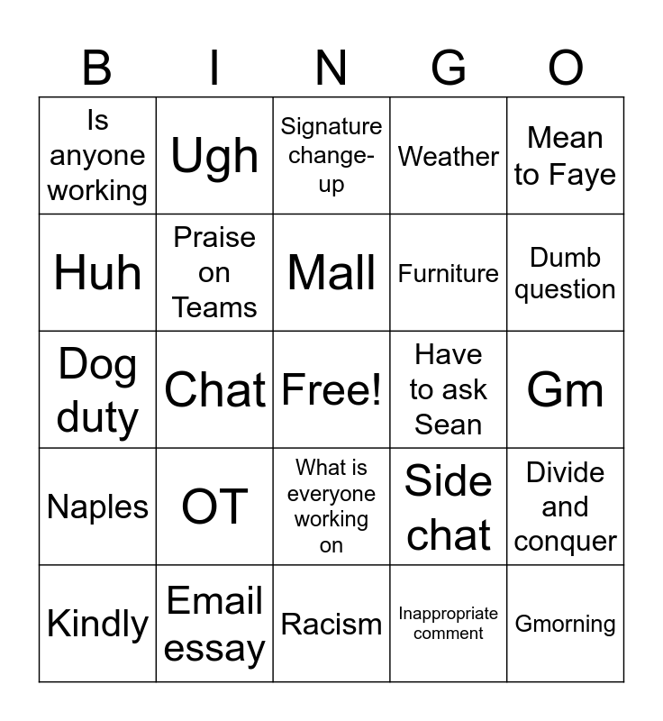 This bingo card has a free space and 29 words: Kindly, Peak, Chat, -, Is anyone working, Signature change-up, Praise on Teams, OT, Have to ask Sean, Email essay, Gm, Gmorning, Racism, Inappropriate comment, Dumb question, Perhaps, What is everyone working on, Naples, Mean to Faye, Dog duty, Side chat, Which version, Furniture, Huh, Weather, Ugh, Divide and conquer, Mall and invalid use “of” quotes.