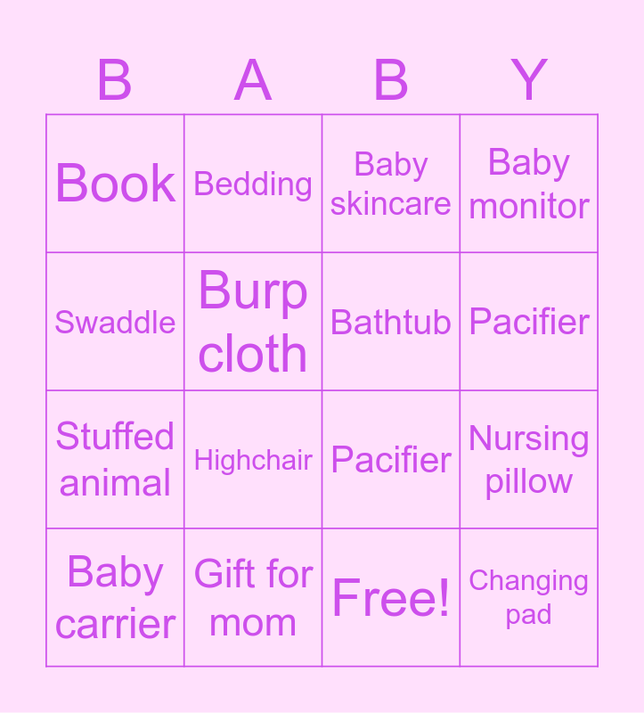 This bingo card has 26 words: Bottle, Toy, Pacifier, Onesie, Swaddle, Book, Burp cloth, Bedding, Free!, Blanket, Stuffed animal, Pacifier, Bib, Teether, Nursing pillow, Diaper bag, Baby monitor, Changing pad, Baby skincare, Baby carrier, Highchair, Bouncer, Gift for mom, Bassinet, Bathtub and Bottle warmer.