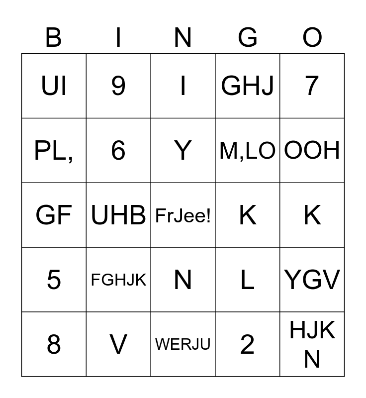 This bingo card has a free space and 34 words: 1, 2, 3, 4, 5, 6, 7, 8, 9, R, Y, I, B, N, K, OOH, V, GF, FGHJK, L, N, J, UI, K, WERJU, HJK N, GHJ, UIO, M,LO, PL,, IJN, UHB, YGV and TFC.