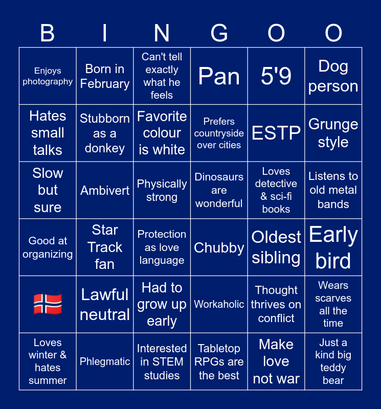 This bingo card has 36 words: Good at organizing, Star Track fan, Interested in STEM studies, Prefers countryside over cities, Loves detective & sci-fi books, Listens to old metal bands, Enjoys photography, Phlegmatic, Can't tell exactly what he feels, Workaholic, ESTP, Dog person, 🇳🇴, Ambivert, Favorite colour is white, Pan, Thought thrives on conflict, Early bird, Hates small talks, Stubborn as a donkey, Protection as love language, Chubby, Oldest sibling, Wears scarves all the time, Slow but sure, Born in February, Physically strong, Tabletop RPGs are the best, 5'9, Grunge style, Loves winter & hates summer, Lawful neutral, Had to grow up early, Dinosaurs are wonderful, Make love not war and Just a kind big teddy bear.