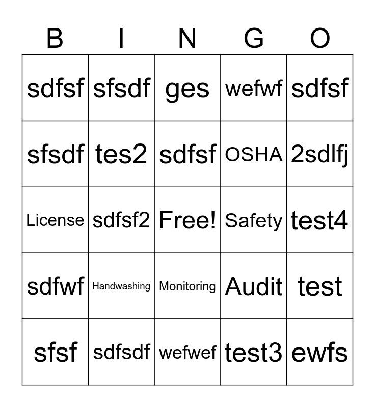 This bingo card has a free space and 24 words: Handwashing, sdfsdf, sdfsf, sfsf, sdfsf, sdfsf, sfsdf, sfsdf, Safety, Monitoring, OSHA, License, Audit, test, tes2, test3, test4, ges, 2sdlfj, sdfsf2, ewfs, sdfwf, wefwf and wefwef.