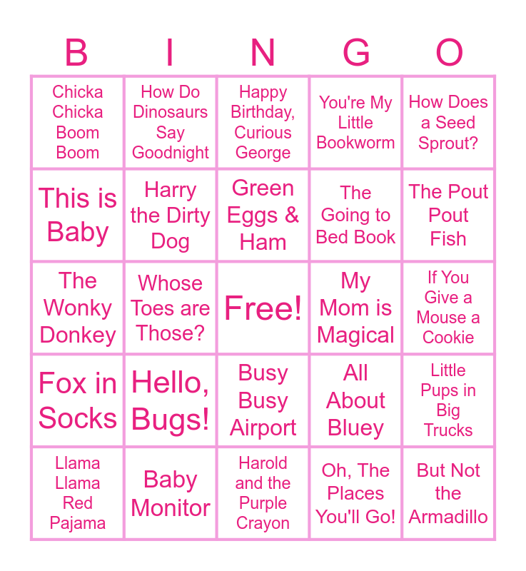 This bingo card has a free space and 40 words: Where Do Jet Planes Sleep at Night, The Wonky Donkey, Dream Big, Little One, Harry the Dirty Dog, Baby Monitor, Busy Busy Airport, Green Eggs & Ham, Baby T. Rex, How Does a Seed Sprout?, Fox in Socks, Whose Toes are Those?, You're My Little Bookworm, But Not the Armadillo, If You Give a Mouse a Cookie, My Mom is Magical, Hello, Bugs!, Where the Wild Things Are, Chicka Chicka Boom Boom, I Took the Moon for a Walk, Happy Birthday, Curious George, Little Pups in Big Trucks, Oh, The Places You'll Go!, The Going to Bed Book, This is Baby, I've Loved You Since Forever, Welcome Little One, Goodnight Moon, The Very Hungry Caterpillar, The Rainbow Fish, Corduroy, Guess How Much I Love You, Llama Llama Red Pajama, Love You Forever, All About Bluey, The Pout Pout Fish, Harold and the Purple Crayon, Brown Bear Brown Bear, What do you See?, The Pigeon Has Feelings, Too, How Do Dinosaurs Say Goodnight and Everything is Mama.