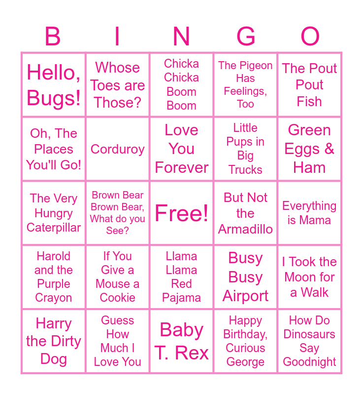 This bingo card has a free space and 40 words: Goodnight Moon, The Very Hungry Caterpillar, The Rainbow Fish, Corduroy, Guess How Much I Love You, Llama Llama Red Pajama, Love You Forever, All About Bluey, The Pout Pout Fish, Harold and the Purple Crayon, Brown Bear Brown Bear, What do you See?, The Pigeon Has Feelings, Too, How Do Dinosaurs Say Goodnight, Everything is Mama, But Not the Armadillo, If You Give a Mouse a Cookie, My Mom is Magical, Hello, Bugs!, Where the Wild Things Are, Chicka Chicka Boom Boom, I Took the Moon for a Walk, Happy Birthday, Curious George, Little Pups in Big Trucks, Oh, The Places You'll Go!, The Going to Bed Book, This is Baby, I've Loved You Since Forever, Welcome Little One, Where Do Jet Planes Sleep at Night, The Wonky Donkey, Dream Big, Little One, Harry the Dirty Dog, Baby Monitor, Busy Busy Airport, Green Eggs & Ham, Baby T. Rex, How Does a Seed Sprout?, Fox in Socks, Whose Toes are Those? and You're My Little Bookworm.