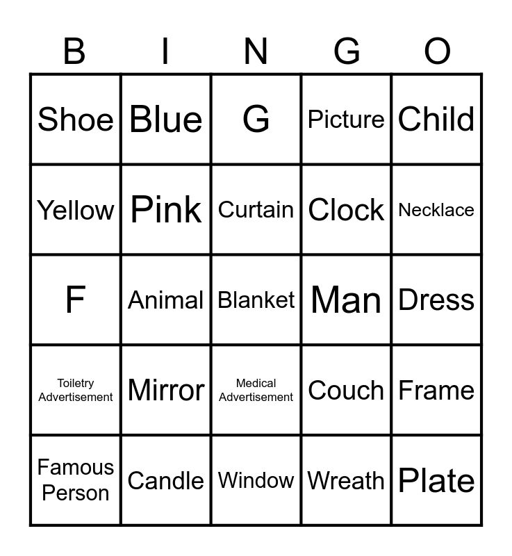 This bingo card has a free space and 49 words: Tree, Plate, Table, Window, Mirror, Shirt, Blue, Red, Yellow, Green, Pink, Picture, Frame, Couch, Chair, Fire, Curtain, Man, Woman, Child, Animal, Wreath, Shoe, Clock, Watch, Necklace, Famous Person, Recipe, Medical Advertisement, Toiletry Advertisement, Houseware Advertisement, Kitchen Gadget, Faucet, Lamp, Candle, Holiday, Store Name, Pants, Dress, A, B, C, D, E, F, G, H, Ball and Game.