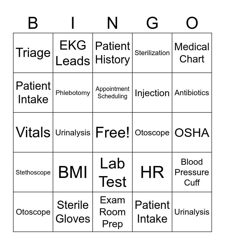This bingo card has a free space and 24 words: Otoscope, BMI, Appointment Scheduling, Patient Intake, Medical Chart, Triage, EKG Leads, Patient History, Otoscope, OSHA, Vitals, Phlebotomy, HR, Blood Pressure Cuff, Patient Intake, Sterile Gloves, Exam Room Prep, Sterilization, Antibiotics, Stethoscope, Urinalysis, Lab Test, Injection and Urinalysis.