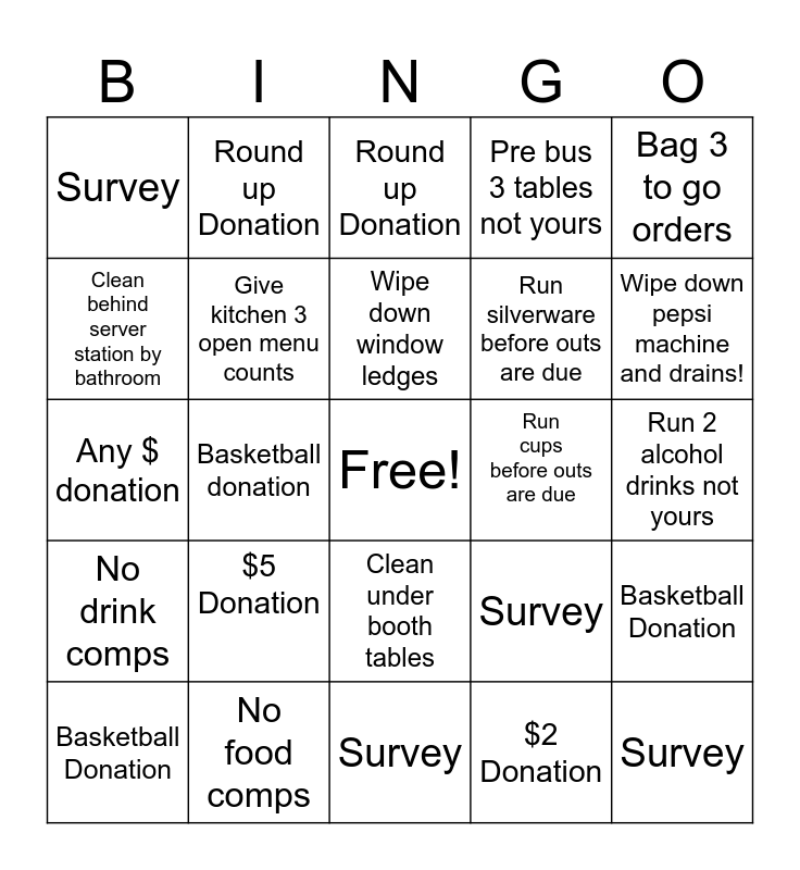 This bingo card has a free space and 24 words: $5 Donation, No food comps, Wipe down window ledges, Basketball Donation, Bag 3 to go orders, Survey, Clean behind server station by bathroom, Round up Donation, Run cups before outs are due, Clean under booth tables, Run silverware before outs are due, Any $ donation, Survey, Basketball Donation, Give kitchen 3 open menu counts, $2 Donation, Run 2 alcohol drinks not yours, Round up Donation, Wipe down pepsi machine and drains!, Basketball donation, Survey, No drink comps, Pre bus 3 tables not yours and Survey.