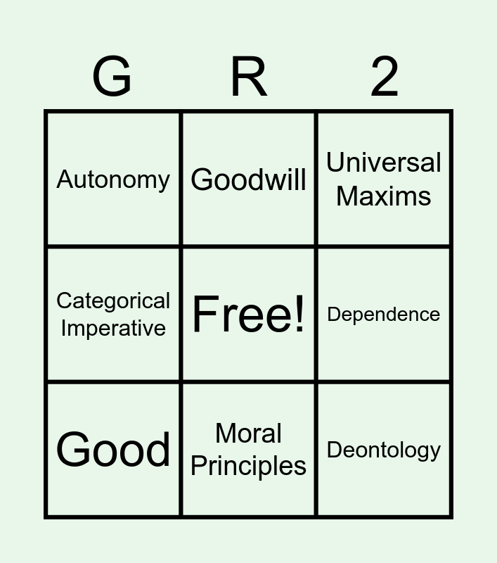This bingo card has a free space and 9 words: Good, Universal Maxims, Goodwill, Categorical Imperative, Autonomy, Dependence, Deontology, Hypothetical Imperative and Moral Principles.