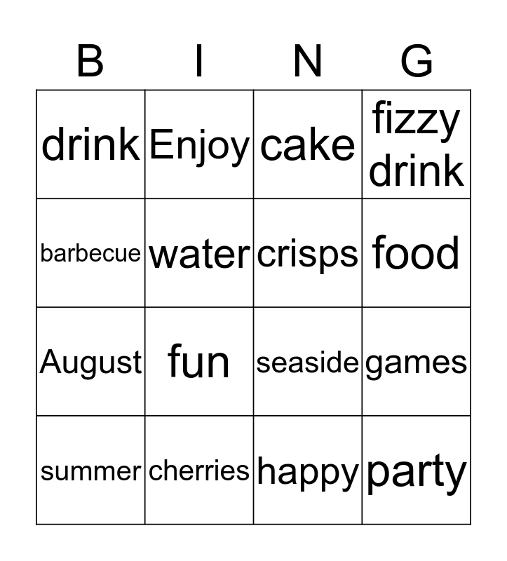 This bingo card has a free space and 15 words: summer, party, cake, drink, food, barbecue, fun, happy, water, August, games, fizzy drink, crisps, Enjoy and cherries.