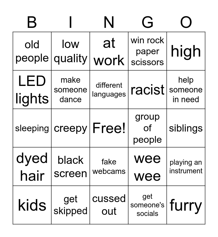 This bingo card has a free space and 24 words: black screen, get skipped, different languages, kids, high, old people, LED lights, low quality, group of people, fake webcams, racist, sleeping, wee wee, playing an instrument, make someone dance, get someone's socials, siblings, at work, help someone in need, creepy, furry, dyed hair, win rock paper scissors and cussed out.
