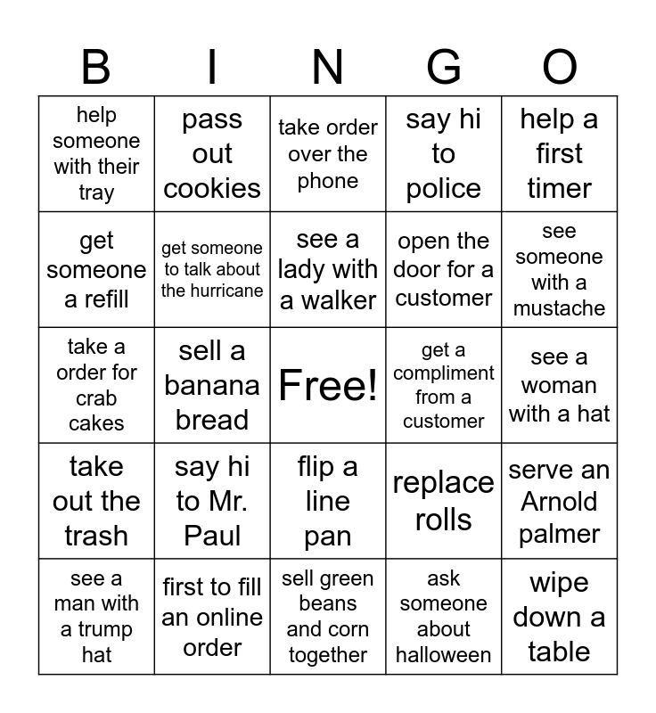 This bingo card has a free space and 24 words: say hi to Mr. Paul, first to fill an online order, see a lady with a walker, see a man with a trump hat, help a first timer, help someone with their tray, get someone a refill, pass out cookies, get a compliment from a customer, flip a line pan, open the door for a customer, take a order for crab cakes, replace rolls, serve an Arnold palmer, get someone to talk about the hurricane, ask someone about halloween, see a woman with a hat, take order over the phone, see someone with a mustache, sell a banana bread, wipe down a table, take out the trash, say hi to police and sell green beans and corn together.