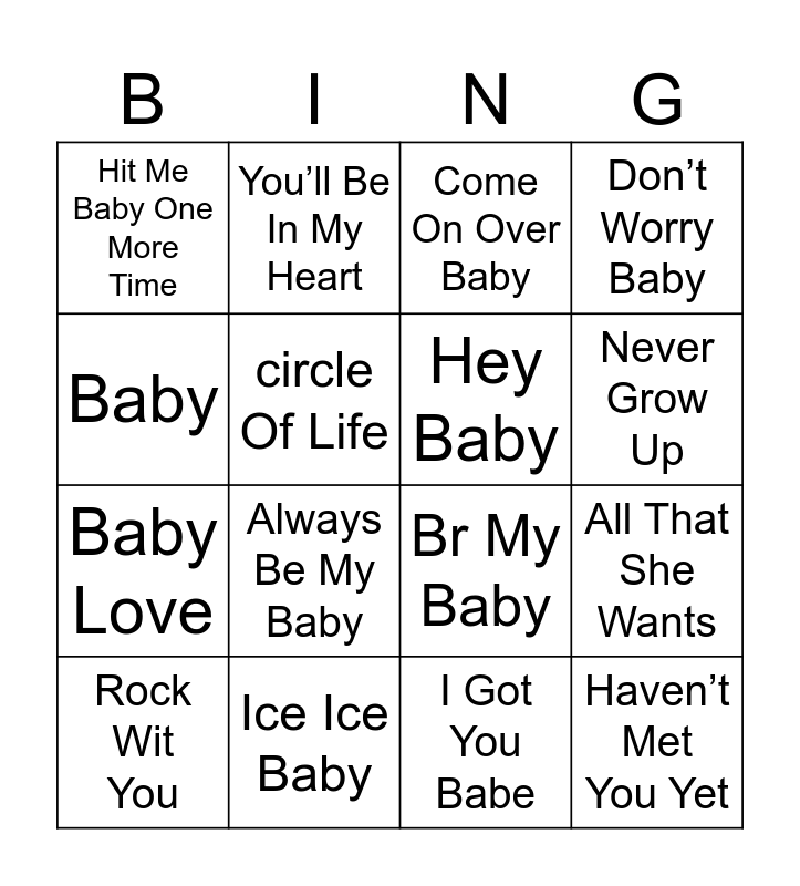 This bingo card has 24 words: Baby Got Back, How Sweet It Is To Be Loved By You, Never Grow Up, Small Bump, Baby, Hit Me Baby One More Time, circle Of Life, You’ll Be In My Heart, Ice Ice Baby, Too Busy Thinking About My Baby, Baby Love, Br My Baby, You Are My Sunshine, Push It, Hey Baby, Baby Boy, I Got You Babe, Come On Over Baby, Always Be My Baby, All That She Wants, Rock Wit You, Haven’t Met You Yet, Don’t Worry Baby and Baby Be Mine.