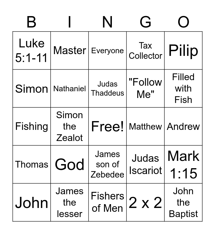 This bingo card has a free space and 24 words: God, James the lesser, Judas Thaddeus, John, Pilip, Luke 5:1-11, Simon, Master, Matthew, James son of Zebedee, "Follow Me", Fishing, Judas Iscariot, Mark 1:15, Nathaniel, 2 x 2, Andrew, Everyone, Filled with Fish, Simon the Zealot, John the Baptist, Thomas, Tax Collector and Fishers of Men.