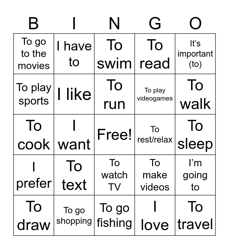 This bingo card has a free space and 32 words: I love, I can, I want, I need, I prefer, I like, It’s important (to), I’m going to, I have to, To ride my bike, To run, To swim, To ski, To dance, To rest/relax, To sing, To draw, To cook, To watch TV, To text, To make videos, To hang out with friends, To sleep, To go shopping, To travel, To read, To play videogames, To play sports, To go to the movies, To go fishing, To skate/rollerblade and To walk.