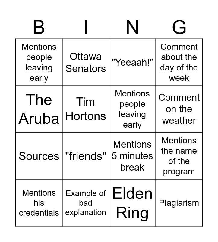 This bingo card has 16 words: Example of bad explanation, Mentions the name of the program, "Yeeaah!", Mentions people leaving early, Sources, Ottawa Senators, Mentions 5 minutes break, Elden Ring, The Aruba, Tim Hortons, Mentions his credentials, Comment about the day of the week, "friends", Comment on the weather, Mentions people leaving early and Plagiarism.