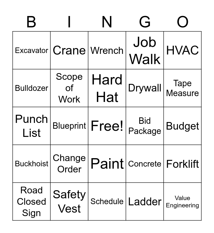 This bingo card has a free space and 24 words: Change Order, Safety Vest, Hard Hat, Road Closed Sign, HVAC, Excavator, Bulldozer, Crane, Bid Package, Paint, Drywall, Punch List, Concrete, Forklift, Scope of Work, Ladder, Budget, Wrench, Tape Measure, Blueprint, Value Engineering, Buckhoist, Job Walk and Schedule.