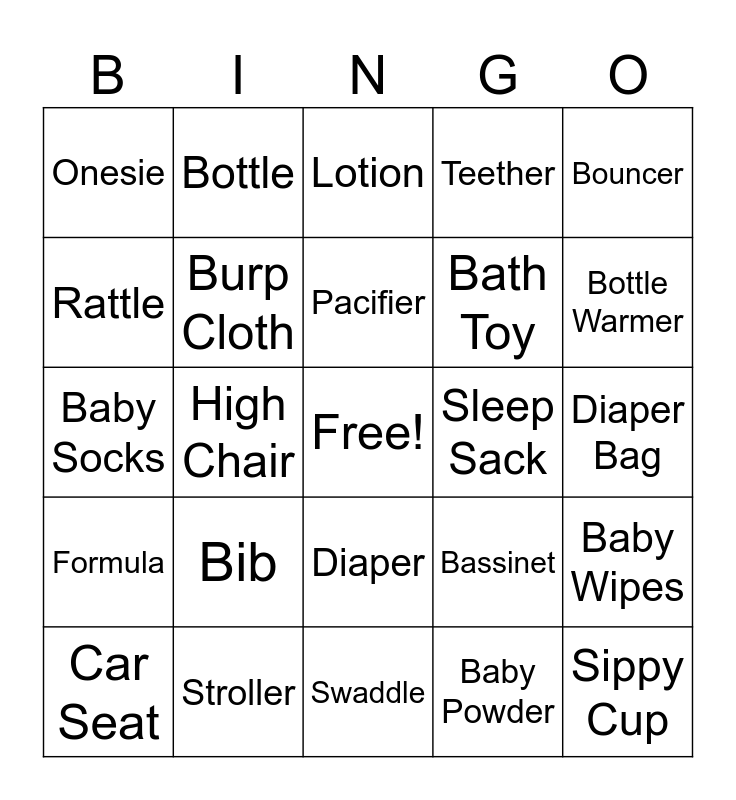 This bingo card has a free space and 24 words: Bib, Stroller, Pacifier, Car Seat, Bouncer, Onesie, Rattle, Bottle, Sleep Sack, Diaper, Bath Toy, Baby Socks, Bassinet, Baby Wipes, Burp Cloth, Baby Powder, Diaper Bag, Lotion, Bottle Warmer, High Chair, Sippy Cup, Formula, Teether and Swaddle.
