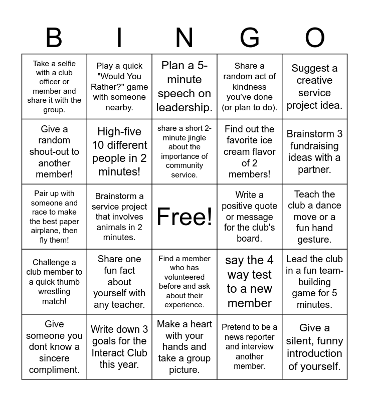 This bingo card has a free space and 24 words: Share one fun fact about yourself with any teacher., Write down 3 goals for the Interact Club this year., share a short 2-minute jingle about the importance of community service., Give someone you dont know a sincere compliment., Suggest a creative service project idea., Take a selfie with a club officer or member and share it with the group., Give a random shout-out to another member!, Play a quick "Would You Rather?" game with someone nearby., Write a positive quote or message for the club's board., Find a member who has volunteered before and ask about their experience., Find out the favorite ice cream flavor of 2 members!, Pair up with someone and race to make the best paper airplane, then fly them!, say the 4 way test to a new member, Lead the club in a fun team-building game for 5 minutes., High-five 10 different people in 2 minutes!, Pretend to be a news reporter and interview another member., Teach the club a dance move or a fun hand gesture., Plan a 5-minute speech on leadership., Brainstorm 3 fundraising ideas with a partner., Brainstorm a service project that involves animals in 2 minutes., Give a silent, funny introduction of yourself., Challenge a club member to a quick thumb wrestling match!, Share a random act of kindness you’ve done (or plan to do). and Make a heart with your hands and take a group picture..