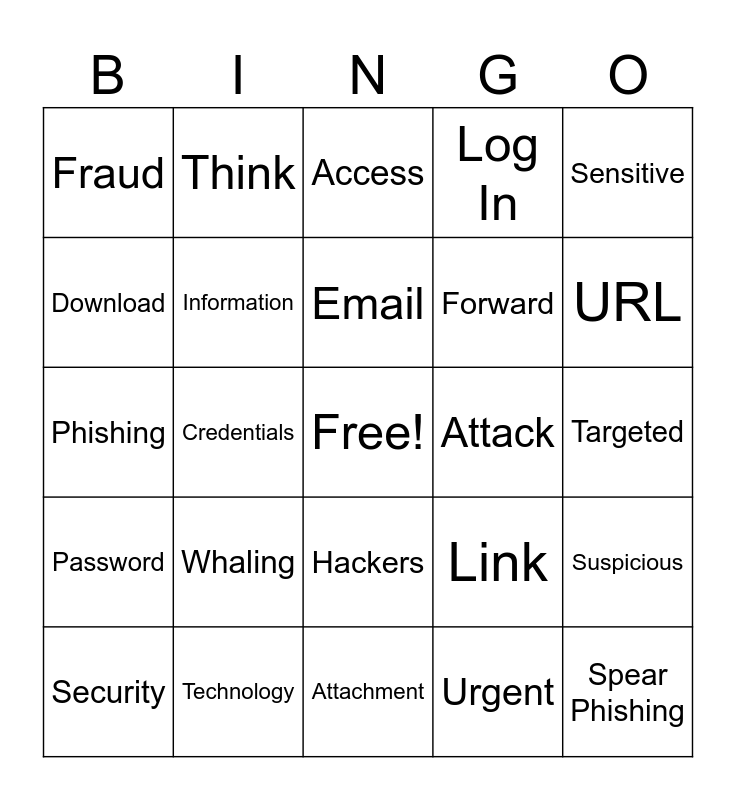This bingo card has a free space and 41 words: Spam, Phishing, Spoofing, Information, Technology, Hackers, Email, Deception, Sensitive, Password, Credentials, Log In, Spear Phishing, Targeted, Attack, Whaling, Pharming, Fraud, Mirror, Access, Suspicious, Hyperlink, Attachment, Forward, Reply, Caution, Urgent, Red Flags, URL, Stop, Look, Think, Security, Click, Link, Download, Alert, Account, Open, Lock and Legitimate.