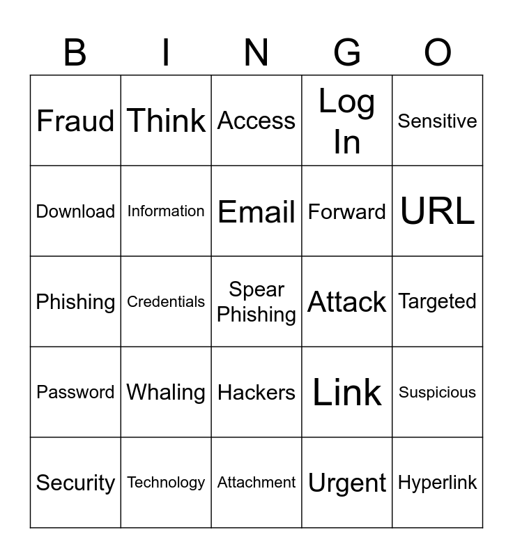 This bingo card has 41 words: Spam, Phishing, Spoofing, Information, Technology, Hackers, Email, Deception, Sensitive, Password, Credentials, Log In, Spear Phishing, Targeted, Attack, Whaling, Pharming, Fraud, Mirror, Access, Suspicious, Hyperlink, Attachment, Forward, Reply, Caution, Urgent, Red Flags, URL, Stop, Look, Think, Security, Click, Link, Download, Alert, Account, Open, Lock and Legitimate.