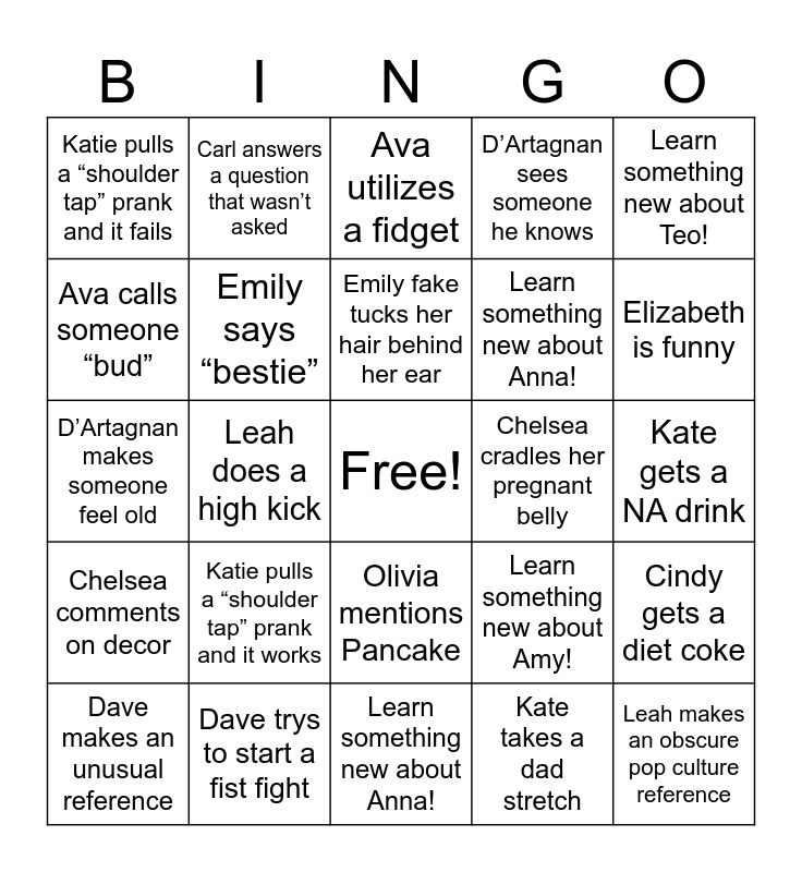 This bingo card has a free space and 27 words: Learn something new about Amy!, Learn something new about Amy!, Learn something new about Anna!, Learn something new about Anna!, Ava calls someone “bud”, Ava utilizes a fidget, Carl answers a question that wasn’t asked, Chelsea comments on decor, Chelsea cradles her pregnant belly, Cindy gets a diet coke, D’Artagnan makes someone feel old, D’Artagnan sees someone he knows, Dave makes an unusual reference, Dave trys to start a fist fight, Elizabeth is funny, Elizabeth has a New England accent, Emily says “bestie”, Emily fake tucks her hair behind her ear, Katie pulls a “shoulder tap” prank and it works, Katie pulls a “shoulder tap” prank and it fails, Kate gets a NA drink, Kate takes a dad stretch, Leah does a high kick, Leah makes an obscure pop culture reference, Olivia mentions Pancake, Learn something new about Teo! and Learn something new about Zoe!.