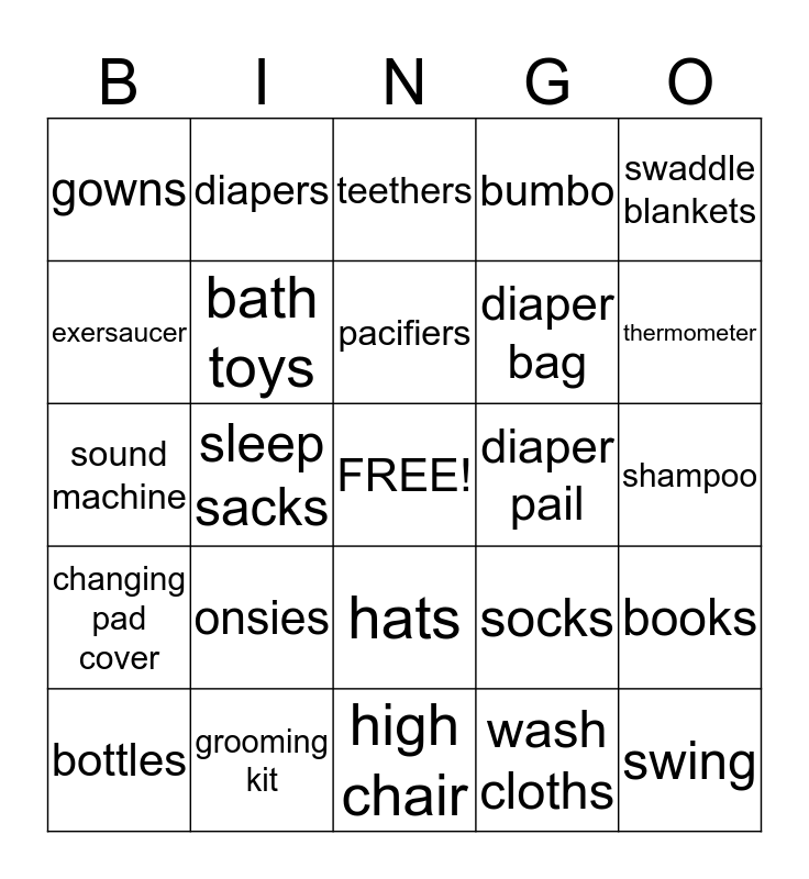 This bingo card has a free space and 34 words: bath towel, wash cloths, crib sheet, dresses, changing pad cover, bath toys, swaddle blankets, bottles, diapers, wipes, pacifiers, teethers, bottle warmer, bath tub, diaper pail, thermometer, grooming kit, sound machine, onsies, socks, hats, sleep and play outfits, gowns, shampoo, high chair, swing, bumbo, booties, diaper bag, exersaucer, lotion, sleep sacks, books and stuffed animals.