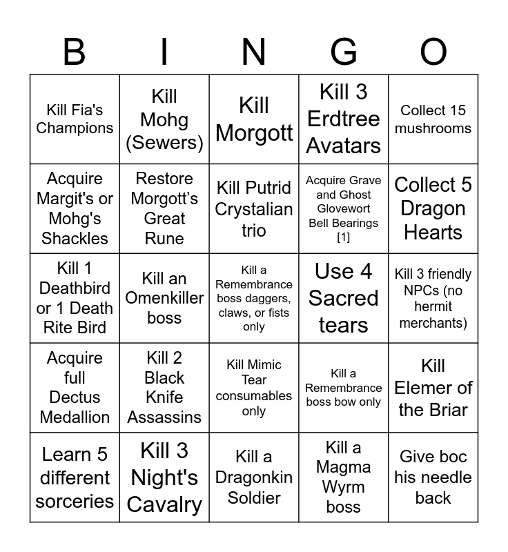 This bingo card has 99 words: Kill Godrick while summoning Nepheli Loux, Kill Rennala after she summons all 4 different spirits, Kill Radahn without summoning NPCs, Kill Morgott, Kill an Ancestor Spirit, Kill Mohg, Lord of Blood, Kill Margit with 4+ parries, Kill Leonine Misbegotten, Kill a Red Wolf Boss, Kill Godskin Noble (Volcano Manor) without status effects, Kill a Godskin Apostle, Kill Godfrey (Gold Spirit), Free!, Kill Mimic Tear consumables only, Kill Valiant Gargoyles, Kill Fia's Champions, Kill Mohg (Sewers), Kill Loretta (Blue Spirit), Kill Commander O'Neil, Kill Grafted Scion (Chapel of Anticipation), Kill Soldier of Godrick bare fist only, Kill Limgrave Tree Sentinel with a +0 weapon only, Kill Agheel with a +0 weapon only, Kill Tree Sentinel duo, Kill Crucible Knight & Misbegotten Warrior duo, Kill Elemer of the Briar, Kill Putrid Crystalian trio, Kill Wormface, Kill Royal Revenant (Kingsrealm Ruins), Kill Varre, Kill a Dragonkin Soldier, Kill a Magma Wyrm boss, Kill a Fallingstar Beast, Kill a 2 dragons, Kill an Omenkiller boss, Kill 1 Deathbird or 1 Death Rite Bird, Kill 2 Cemetery Shades, Kill 2 Watchdogs, Kill 2 Duelist bosses, Kill 2 Black Knife Assassins, Kill 3 Crucible Knights, Collect 5 Dragon Hearts, Kill 3 Erdtree Avatars, Kill 3 Night's Cavalry, Kill 2 Tibia Mariners, Kill 2 Bell Bearing Hunters, Kill 3 duo/trio bosses, Kill 5 bosses that ride a horse, Kill Patches, Complete evergaol hitless, Kill a Remembrance boss colossal armaments only, Kill a Remembrance boss daggers, claws, or fists only, Kill a Remembrance boss bow only, Kill a Remembrance boss jump attack only, Kill a Remembrance boss hitless, Kill a boss Spirit Ashes only, Kill a boss Consumables only, Kill a boss on Torrent the whole fight, Finish off a boss with the explosive physick, Kill 6 bosses in Limgrave, Kill 4 bosses in Liurnia, Kill 3 bosses in Caelid, Kill 6 bosses in Altus Plateau, Complete 2 catacombs, Win an envasion, Collect 15 mushrooms, Complete 1 Hero's Grave, Complete 3 evergaols, Acquire 3 different Remembrances, Acquire full Dectus Medallion, Acquire 2 Great runes, Acquire Grave and Ghost Glovewort Bell Bearings [1], Acquire Margit's or Mohg's Shackles, Restore Godrick’s Great Rune, Restore Radahn’s Great Rune, Restore Rykard’s Great Rune, Restore Morgott’s Great Rune, Somber +9 weapon, Somber Smithing stone +4 weapon, Spirit Ash +4 summon, Use 4 Sacred tears, Acquire 5 Physick Flask tears, Acquire 6 different Talismans, Take Rya's hand to Volcano Manor, Invade and defeat Magnus the Beast Claw, Dupe a Remembrance at a Mausoleum, Memory of Grace with 50k+ Runes, Kill 2 NPC invaders, Kill 3 friendly NPCs (no hermit merchants), Learn 5 different sorceries, Learn 5 different incantations, Reach lvl 40, Give boc his needle back, Kill 2 Tree spirits, Kill 2 Red wolves, Kill the Milicent invader in Caelid, Collect 3 unique Staves, Collect 2 Painting rewards and Kill Godrick while Nepheli Loux is alive.